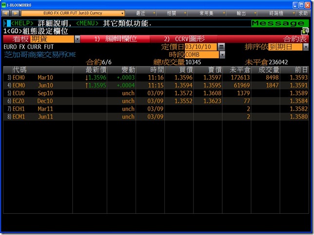 比如我選了EUR/USD Futures (CME 歐元期貨),選取 CT 合約表,就可以進入商品月份清單啦,或者你可以直接在這個畫面把代碼記下來。